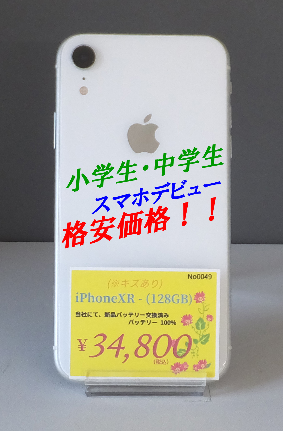 iPhoneXR-(128GB)画面にここだよと言わないと分からないレベルのキズあり。No.0049